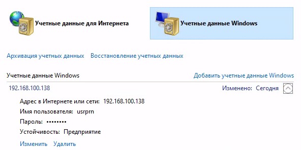 - «Пуск», «Панель управления», «Учетные записи пользователей», «Диспетчер учетных данных»